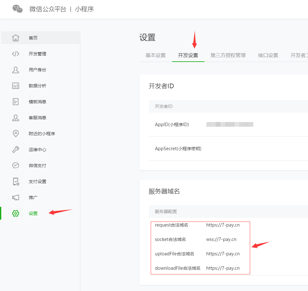 2.请到“设置” -> “开发设置” -> “服务器域名”,设置域名 均为7-pay.cn