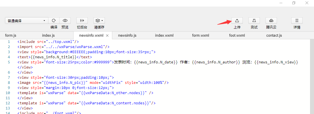 6.小程序开发工具右上角,点击“上传”按钮,将文件上传